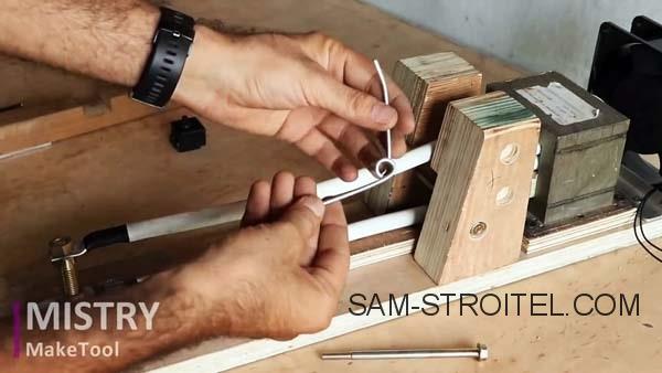 Части с косиной и накладками ставим на основание и прижимаем к трансформатору вертикальной стороной так, чтобы между ними сверху свободно качался брус из дерева.