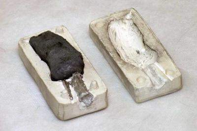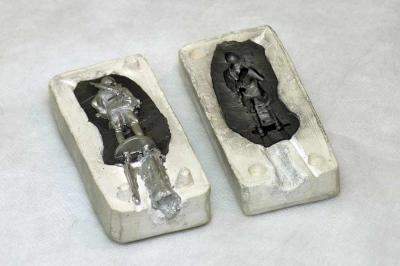 Силиконовую оболочку модели аккуратно разрежьте острым скальпелем и выньте модель так, чтобы не повредить силикон. Также желательно дождаться полного высыхания гипсовой формы прежде, чем приступать к литью олова.