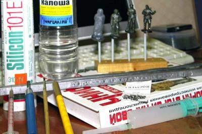 Сначала кое-чему научился сам, попробовал различные технологии на основе силикона и в середине 2004 года получил вполне приличные результаты. Потом научил жену. Она увлеклась еще больше меня. В январе 2005 года подготовил серию фотографий основных стадий изготовления формы и литья и собирался разместить статью на этом сайте, но уважаемый Gefreiter тогда меня опередил. А технология была практически одинаковая. Все было отложено в долгий ящик и руки дошли только сейчас, два года спустя. Это объясняется тем, что сам уже перестал «творить» — некогда. А жена стесняется столь неженского увлечения. Однако, получается у нее, на мой взгляд, весьма неплохо, особенно меня поразило качество совсем мелкого литья. Все, правда, отливает только копии, сама не лепит. Зато теперь оружия и амуниции для модификации стандартных фигур и создания диорам дома целые кучи. Вот я и решил выложить фотки, может кому интересно станет — расспрошу подробности технологии и опишу здесь.